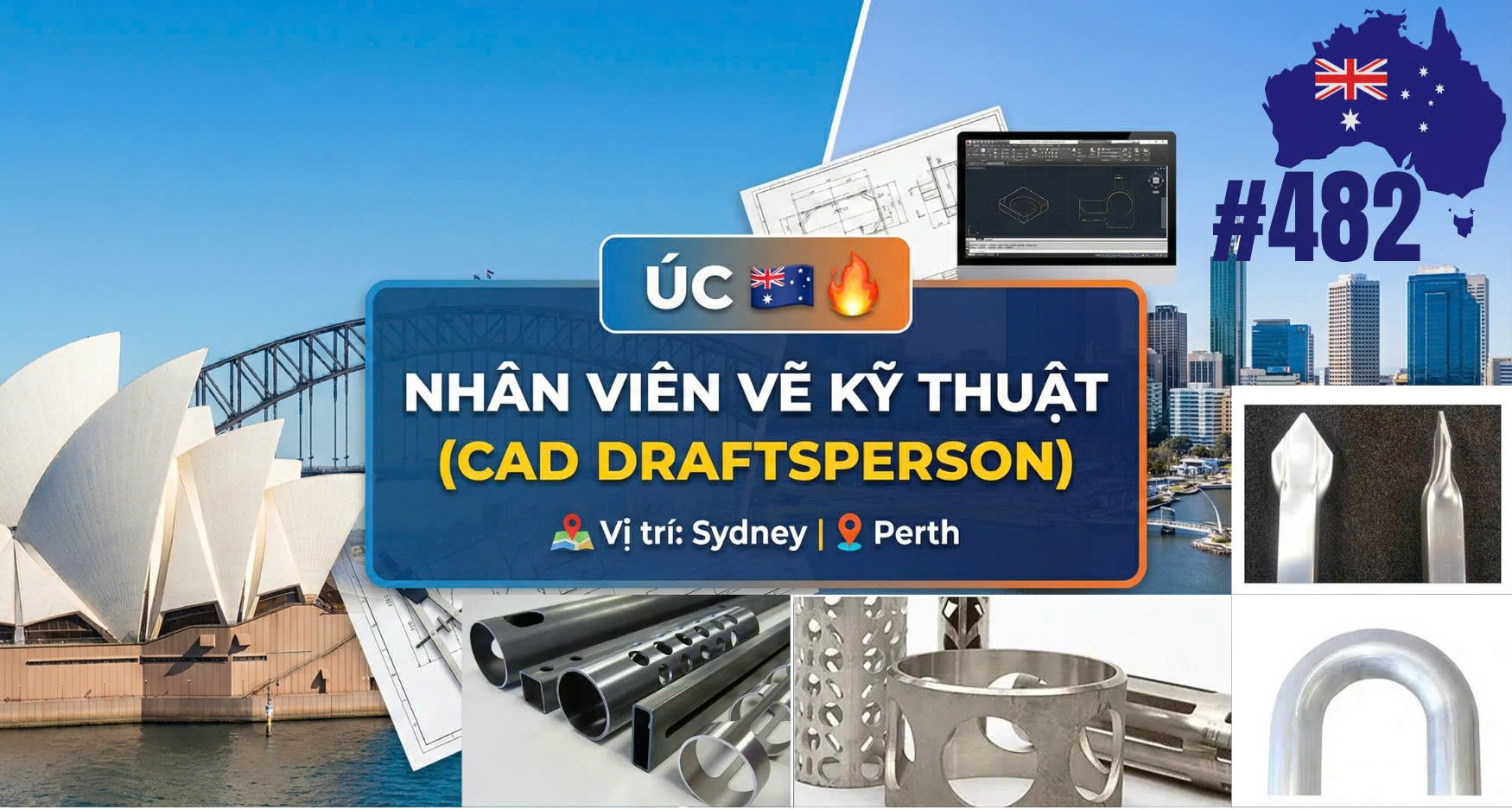 Tuyển nhân viên vẽ kỹ thuật CAD tại Sydney & Perth. Lương 76,515 AUD/năm, visa 4 năm, vợ chồng open work, con học miễn phí, hỗ trợ lên PR visa 186.